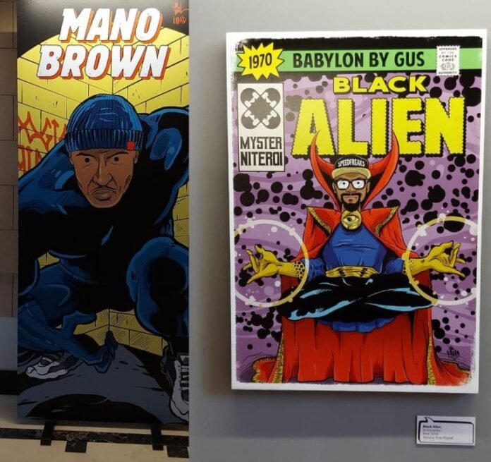 Saiba mais: O Museu das Favelas em parceria com a Ação Educativa está com a exposição ‘Rap em Quadrinhos’. Idealizada pelo ilustrador Wagner Loud e Youtuber Load, é uma homenagem às notáveis personalidades do rap nacional, representadas como autênticos super-heróis em um universo rico em quadrinhos. Ao todo, são 19 artistas homenageados, algumas das obras trazem Mano Brown representado como Pantera Negra, rei de Wakanda, do universo Marvel. Negra Li personificada como a Tempestade, icônica personagem dos X-Men e Sabotage assume o papel de Dr. Manhattan, personagem da DC Comics.