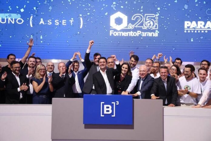 PRESENÇAS – Também participaram do anúncio na B3 o secretário estadual da Agricultura e do Abastecimento, Márcio Nunes; o secretário de Comunicação, Cleber Mata; o diretor Administrativo do BRDE e ex-presidente da Fomento Paraná, Heraldo Neves; o presidente do Sistema Ocepar, José Roberto Ricken; os deputados federais Pedro Lupion e Arnaldo Jardim; e o Chief Information Officer (CIO) da Suno Asset, Vitor Duarte. Pela Fomento Paraná, estiveram presentes as diretoras Administrativa e Financeira, Mayara Puchalski, e Jurídica, Louise Garnica; os diretores de Operações do Setor Público, Mounir Chaowiche; Operações do Setor Privado, Renato Maçaneiro; e de Mercado, Vinícius Rocha.